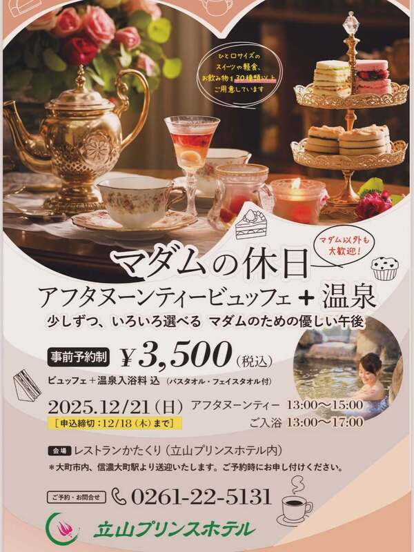 そんな皆様にアフタヌーンティーブッフェと温泉♨️はいかがでしょうか?
